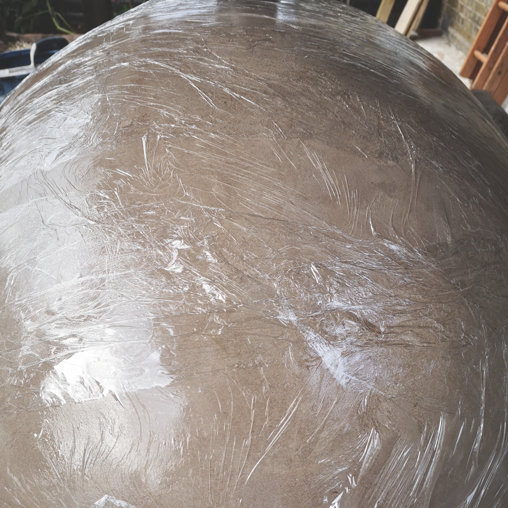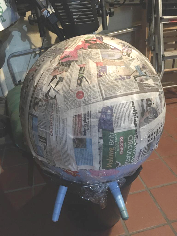 So I got my dad involved… he’s a master at paper måcheté and he offered to help me out with something to guide me. His take: a space hopper covered with about 3-4mm of paper måcheté (which I think looks a bit like the death star – for all you Star Wars geeks out there). He then cut and reshaped to fit my oven door.The great thing about paper måcheté is you can fill it up with sand, cover it with your clay mix, then when you’re ready to remove the sand (to start the drying process) you just burn the paper shell inside!