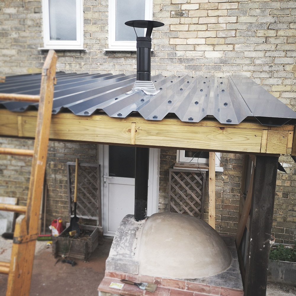 So I decided to skip that part and just buy a pre-made version from Vitcas. The main reason I opted to do this was because i’m building a much larger metal roofed cooking area and I needed to fit a 1.5 meter 4″ chimney so I didn’t want to make something that was going to collapse and damage my roof. All I needed to add to the chimney was a pipe fitting which I fire cemented into the top and left to set until later. I bought my piping from The Cosy Owl through Amazon or you can contact them through Volsom.