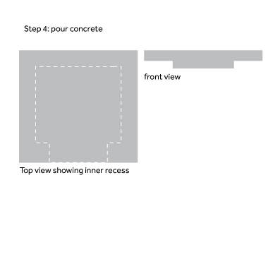 I then poured half of my concrete mix into the framework and laid steel rods into the structure using the outside walls as supporting structures (3 horizontal and 3 vertical). The rest of the concrete was then added and I spent the next hour levelling the surface and making sure as many bubbles were removed. The image gives you a boring but good idea of what it looked like at this stage (you will also notice I screwed in supports to the outside frame to keep it level). Step 4 shows the concrete structure cross-section.