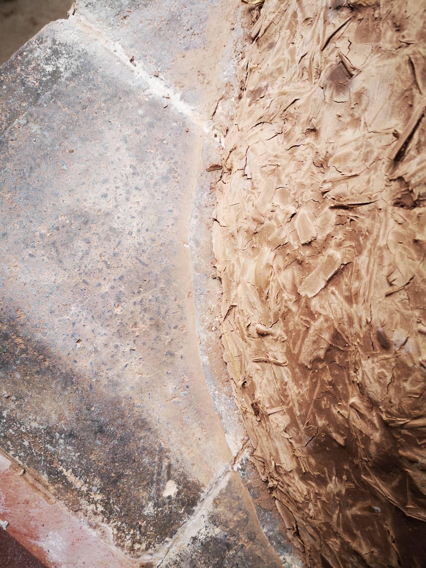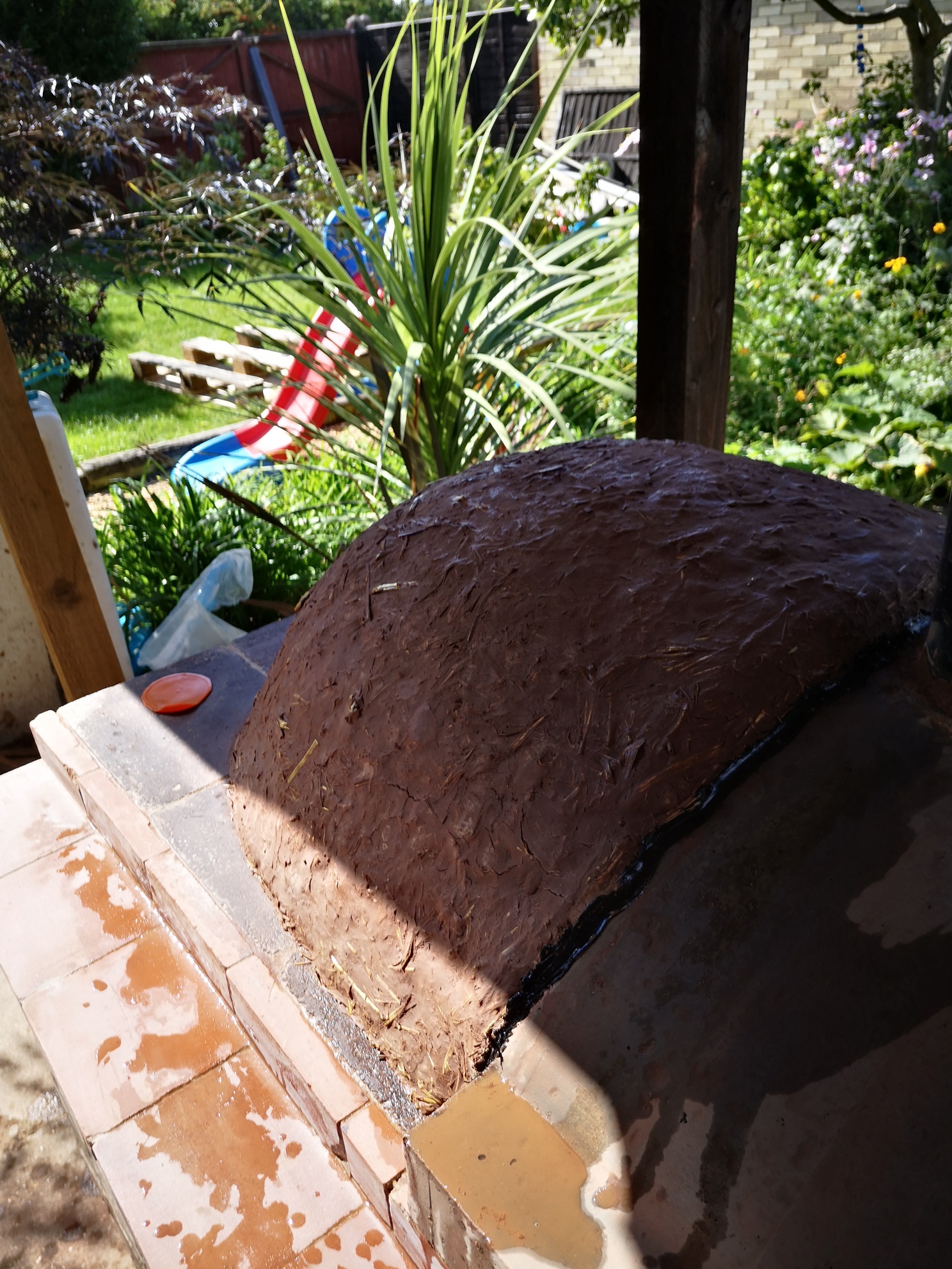 The previous clay and hay layer (second coat) shrunk after the first firing by about 10mm and before adding the lime mortar I made sure this was rehydrated with some water in order to adhere.