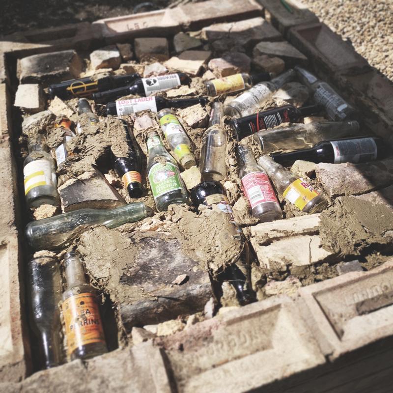In the end I decided to do a mix of bottles and broken up back plates from an old fireplace. The bottles are in the main area where the heat will stand and the fireplace bricks are around the edges to help protect any of the outer building bricks (see image).